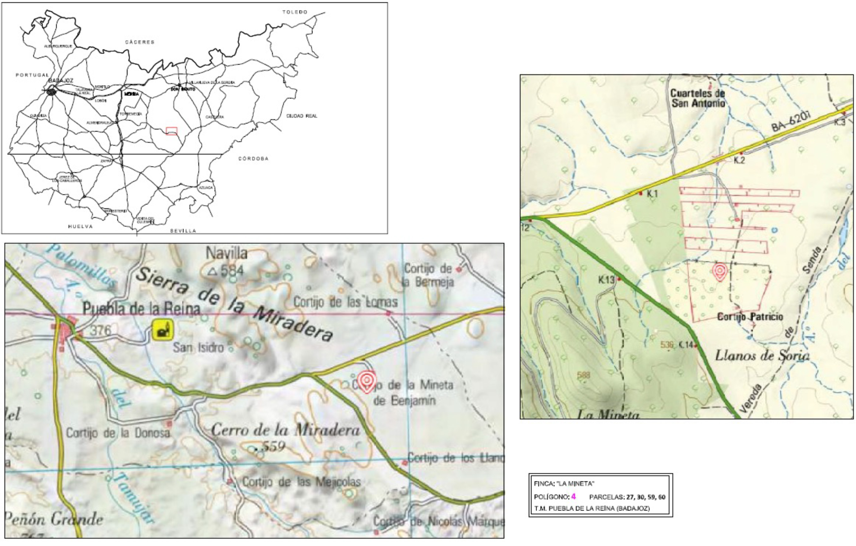 La superficie a transformar en regadío se corresponde con el polígono 4, parcelas 27, 30, 59 y 60 del término municipal de Puebla de la Reina (Badajoz). Dichas parcelas, se abastecerán a través de cuatro pozos de sondeo situados en la misma zona del proyecto, polígono 4, parcela 59, del término municipal de Puebla de la Reina (Badajoz).