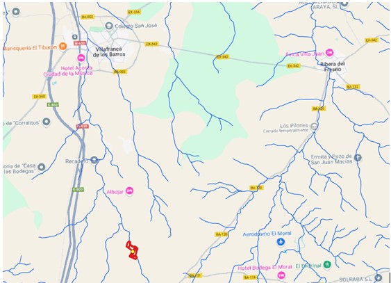 Parte de la superficie de riego se encuentra dentro de la zona de policía del arroyo del Gato, no así la captación de aguas subterráneas que se encuentra a unos 220 m del referido arroyo.