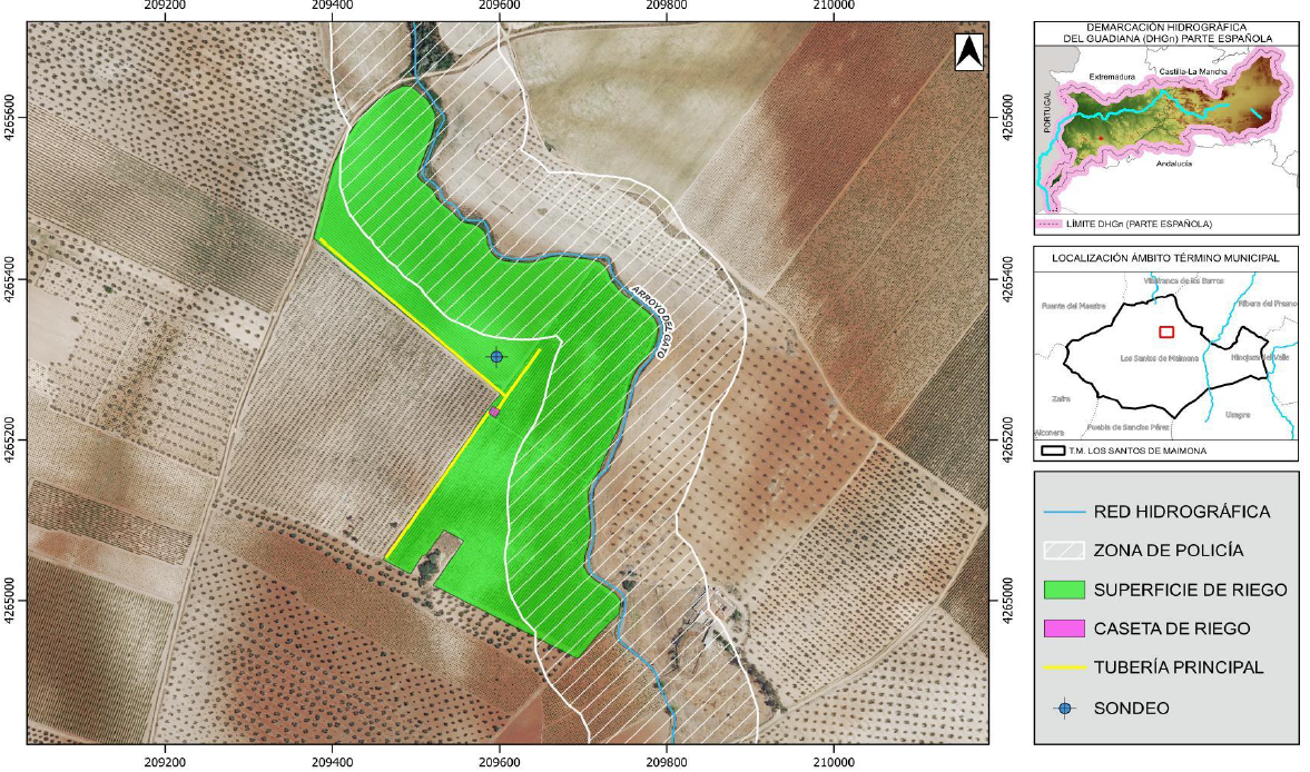 La finca sobre la que se solicita la concesión de aguas subterráneas se encuentra en el paraje Barbaza , en el polígono 6, parcela 110, del término municipal de Los Santos de Maimona (Badajoz). Se trata de una zona predominantemente agrícola donde son muy comunes las plantaciones de especies leñosas. Las parcelas del proyecto se encuentran completamente fuera de superficie de la Red Natura 2000.