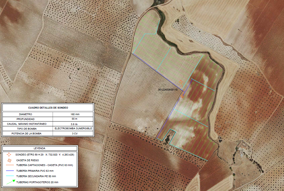 Actualmente los trabajos ya han sido ejecutados, se ha realizado el pozo de sondeo, caseta de riego y tuberías primarias y secundarias. La finalidad del proyecto es obtener la concesión de aguas subterráneas para regar una superficie de 12,88 ha de viñedo. El volumen a solicitar de agua para el cultivo es de 32.880,52 m3/año, lo que corresponde a una dotación de 2.552,84 m3/ha/año. La promotora solicito a fecha de 24 de enero de 2020 la concesión de aguas subterráneas ante la CHG.