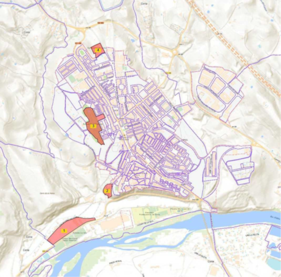 La modificación puntual n.º 32 de las Normas Subsidiarias de Planeamiento Municipal de Coria afecta a suelo no urbanizable en las zonas 1, 2 y 4 y a suelo urbano de espacios libres y zonas verdes en la zona 3.