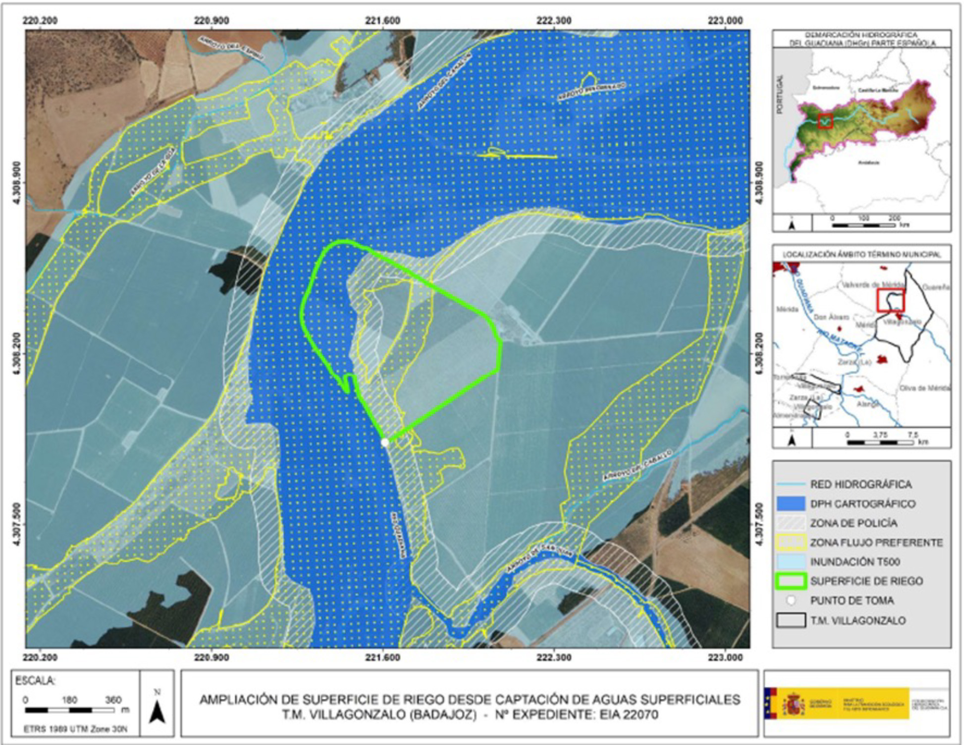 Primeramente, la Confederación Hidrográfica del Guadiana, informó que parte de la superficie de riego se ubicaría dentro del DPH cartográfico del río Guadiana. También que las parcelas afectadas por la actividad están dentro de los terrenos cubiertos por las aguas durante las avenidas extraordinarias T100 y T500, así como parcialmente en zona de flujo preferente. Por ello, informaron que esa superficie deberá quedar fuera de la ampliación de riego solicitado.