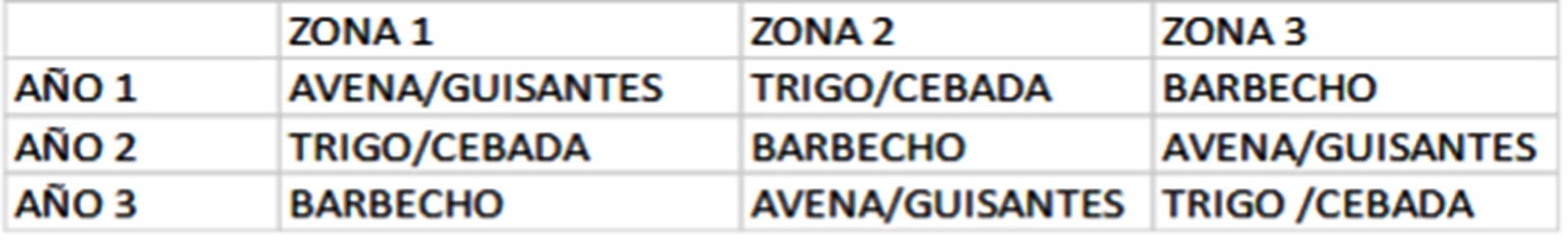— Rotaciones de cultivo. La sucesión de cultivos tiene como principal beneficio la mejora de la rentabilidad de la explotación, así como mejorar los niveles de materia orgánica, incrementar los rendimientos, etc. Para ello, la parcela se va a dividir en 3 zonas con una superficie de 37,33 ha cada una. Por lo que quedaría tal y como podemos observar en la siguiente tabla: