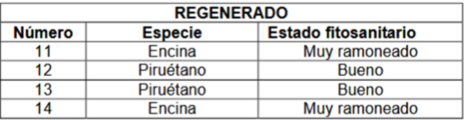 1. Se respetará todo el arbolado (diámetro superior a 15 cm) y el regenerado existente de altura superior a 1,5 m. Las matas de altura inferior se respetarán también siempre que no haya otra mata (regenerado) a respetar en un diámetro de 10 m.