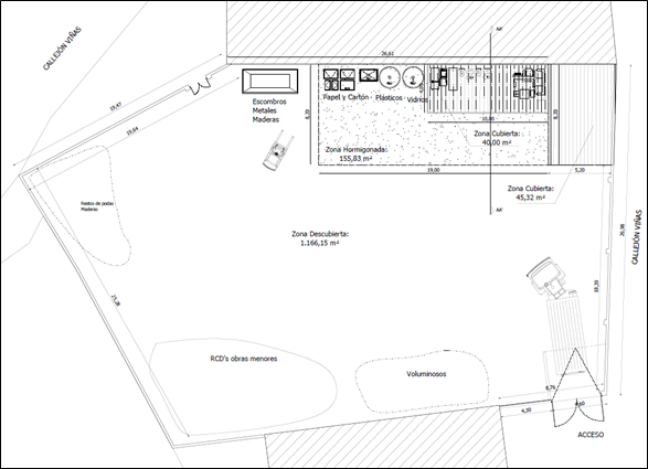 La superficie a ocupar por el recinto es de 400 m2, de forma irregular. Todo el recinto estará vallado mediante base de bloques de hormigón y malla metálica de 2 m de altura, y tendrá acceso a través de una misma puerta para todo tipo de vehículos. Dispondrá de una zona cubierta para proteger los residuos peligrosos del agua de lluvia. La zona de almacenamiento en contenedores contará con una solera de hormigón mientras que el resto de la parcela se nivelará con zahorra compactada.