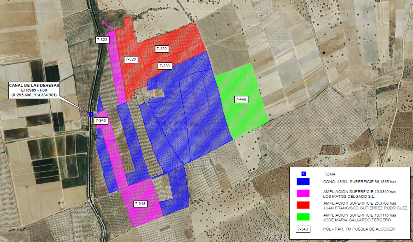 Las parcelas objeto del modificado tienen un total de 148,7071 has, de las que ya tienen concesión (CONC. 48/04) una superficie de 86,1865 has. Se riega actualmente desde el Canal de las Dehesas. El cultivo a regar es olivar.