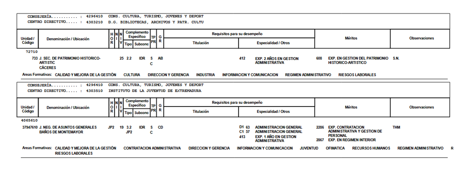 — Puesto con código n.º 37947610 denominado Jefe/a de Negociado de Asuntos Generales adscrito al Instituto de la Juventud de Extremadura de la Consejería de Cultura, Turismo, Jóvenes y Deportes, ubicado en Baños de Montemayor.