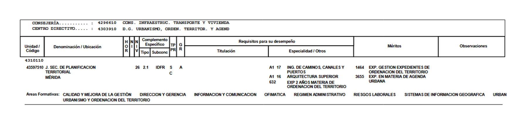 — Puesto con código n.º 43597510 denominado Jefe/a de Sección de Planificación Territorial adscrito a la Dirección General de Urbanismo, Ordenación del Territorio y Agenda Urbana de la Consejería de Infraestructuras, Transporte y Vivienda, ubicado en Mérida.