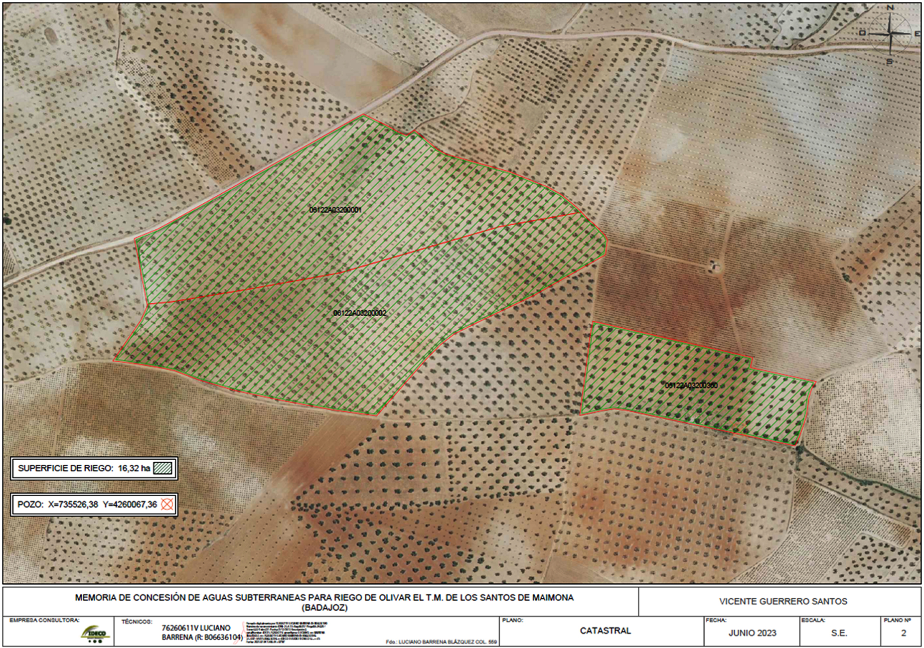 La superficie a transformar en regadío se corresponde con el polígono 32 parcelas 1,2 y 360 del término municipal de Los Santos de Maimona (Badajoz).