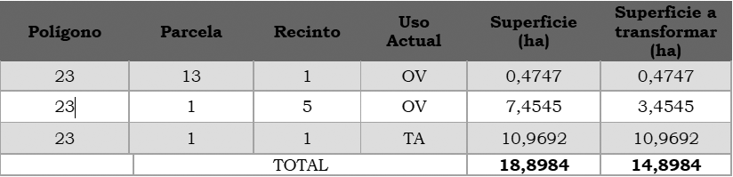 En el recinto 1 de la parcela 1 del polígono 23 (10,96 ha), cuyo uso actual es tierra arable, se establecerá una plantación de olivar en superintensivo con un marco de plantación de 4,5 x 1.5 m2, con la variedad arbequina.